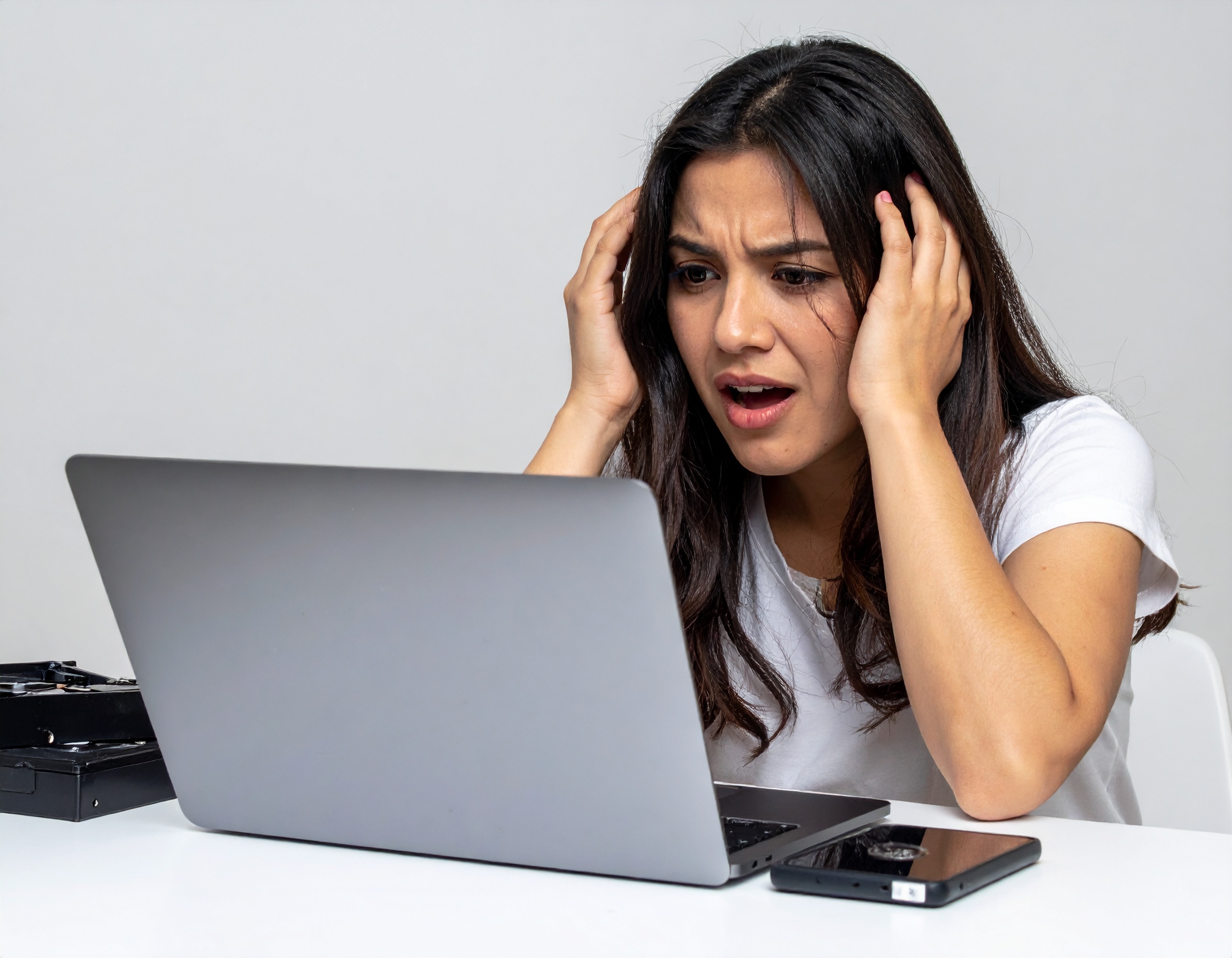 Firefly verzweifelte Frau am Notebook da neue Festplatte defekt 462687