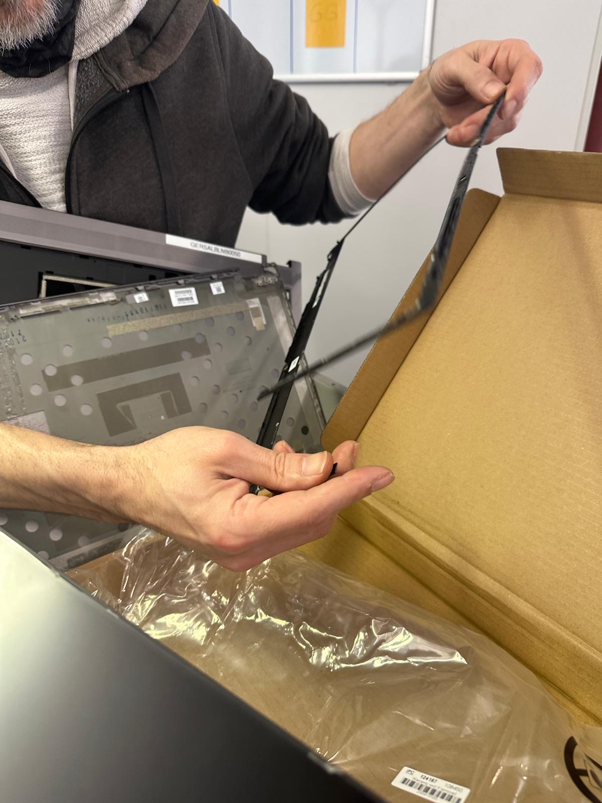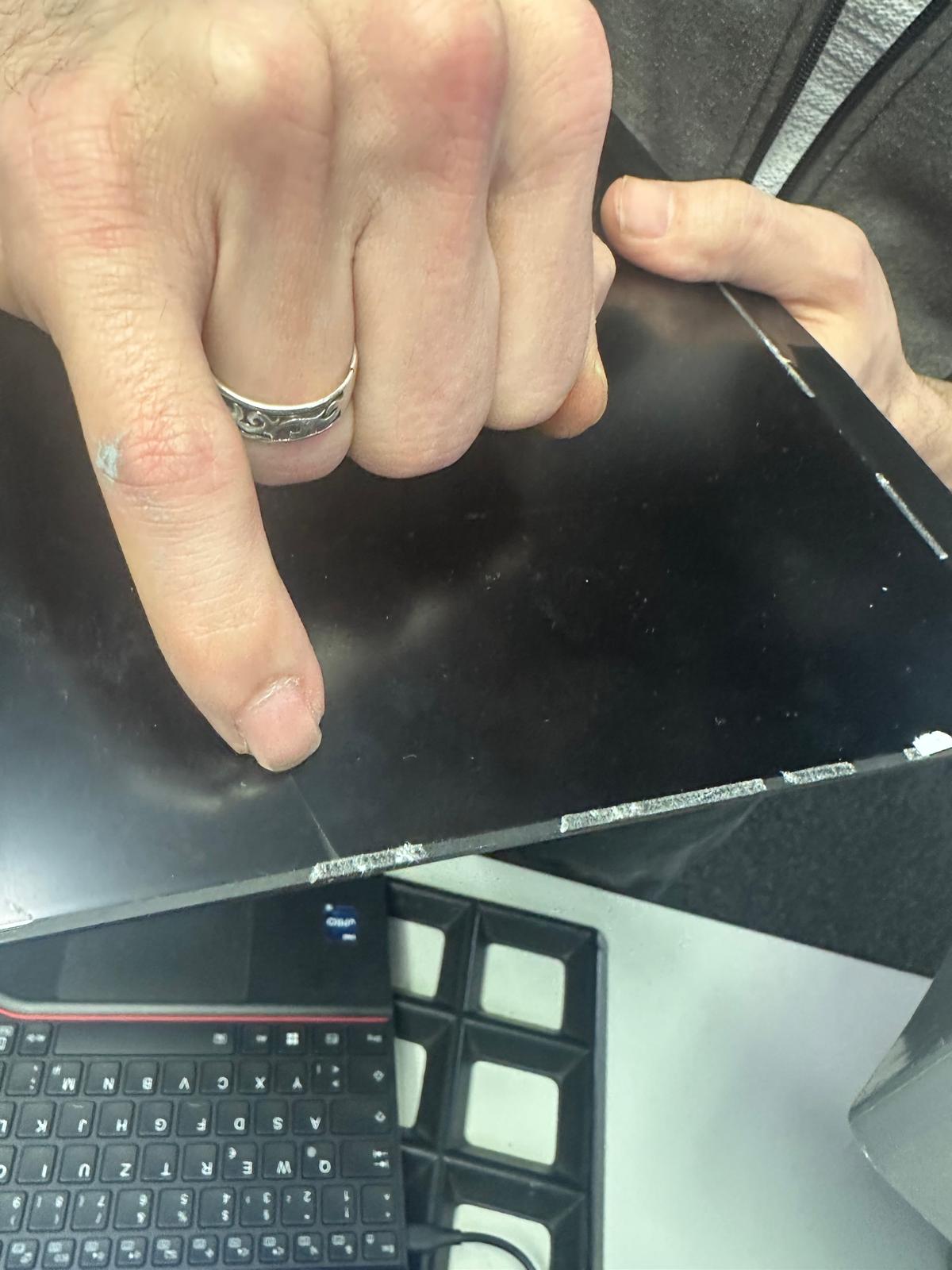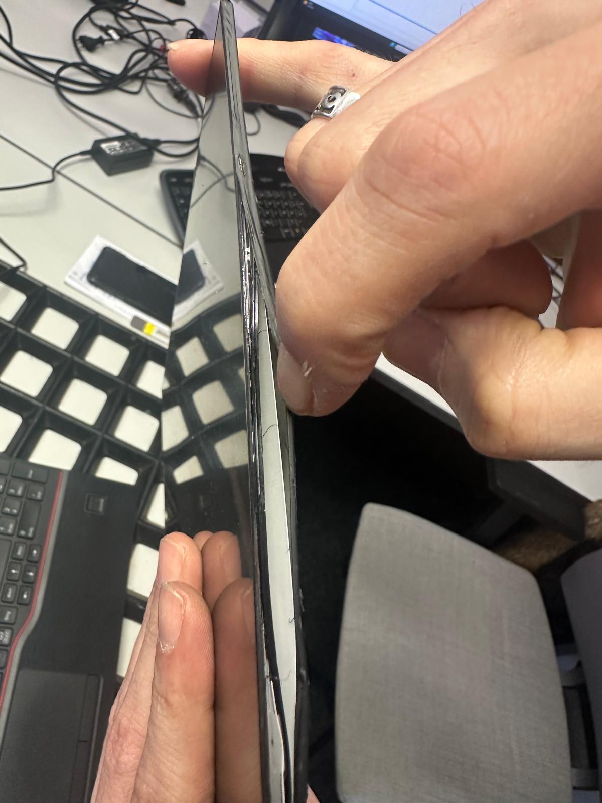 Beim Versuch, den Displayrahmen abzunehmen, kam es zum entscheidenden Punkt: – ist dem Techniker das passiert, wann niemand braucht – das Display wurde durch das Hebeln beschädigt und ist gesprungen.