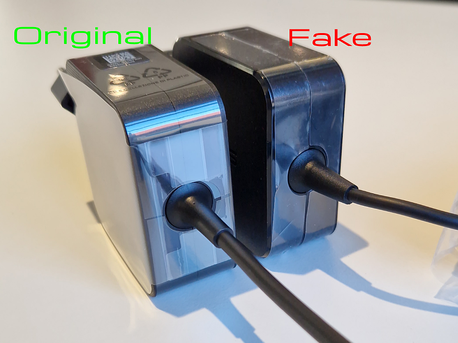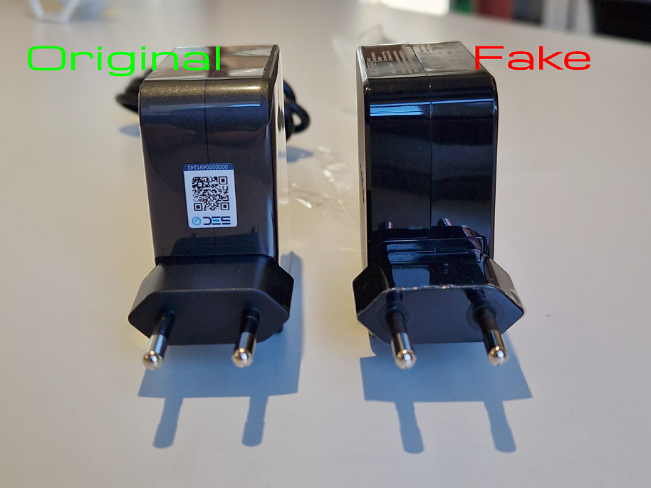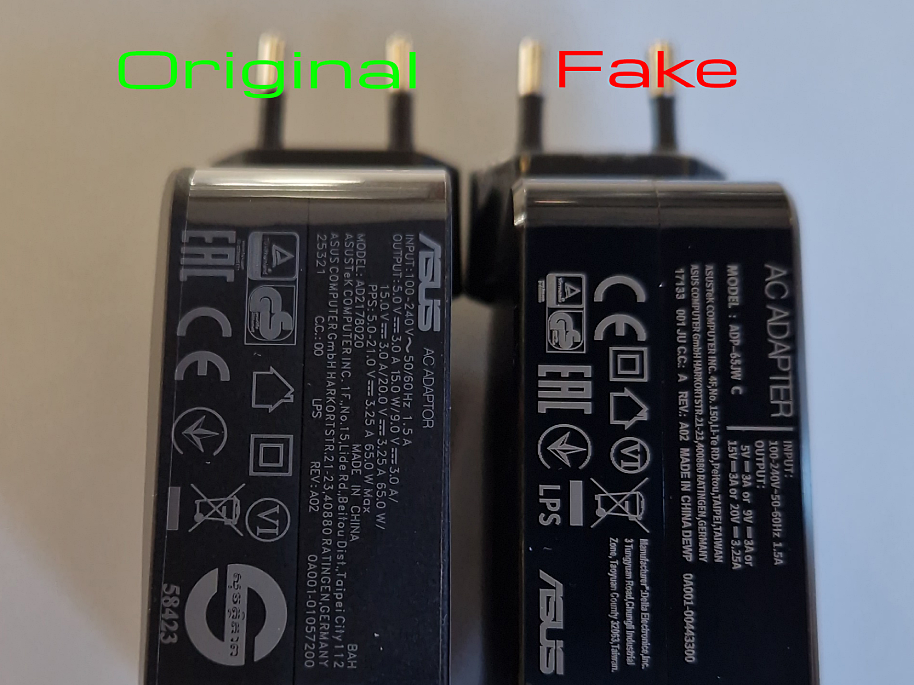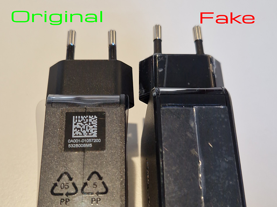 Im direkten Vergleich mit dem Original-Netzteil sind diese Abweichungen ein klarer Hinweis auf eine Produktfälschung: