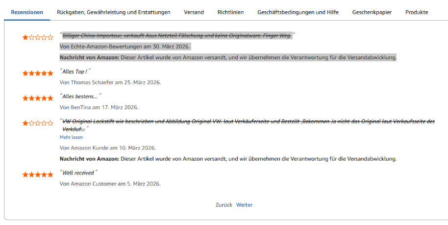Dieses Beispiel zeigt deutlich: Produktfälschungen auf Amazon sind kein Versehen, sondern ein strukturelles Problem des Online-Riesen. Das Löschen der negativen Bewertung mit dem Hinweis Amazon übernimmt die Verantwortung für den Versand von Plagiaten ist entlarfend!